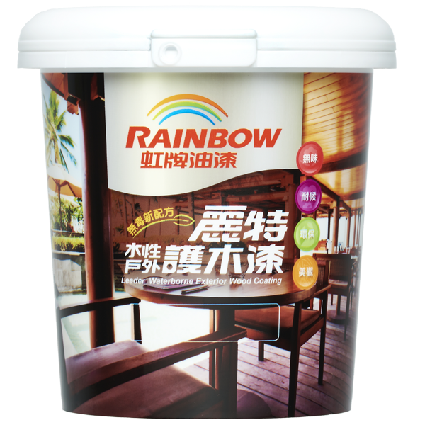 虹牌「麗特水性戶外護木漆」專為戶為木器設計,原料採用知名大廠木器專用樹脂與填料,環保無毒,乾燥成膜後具良好清晰度,可凸顯原木的細緻紋理,經保護的木材表面不易產生龜裂等老化現象,施工簡單、效果絕佳,共有8種不同色彩可供選擇!