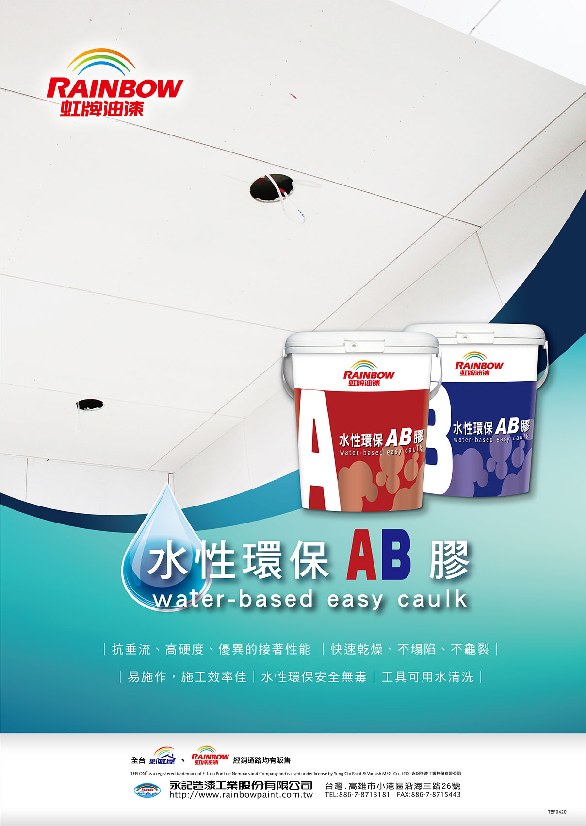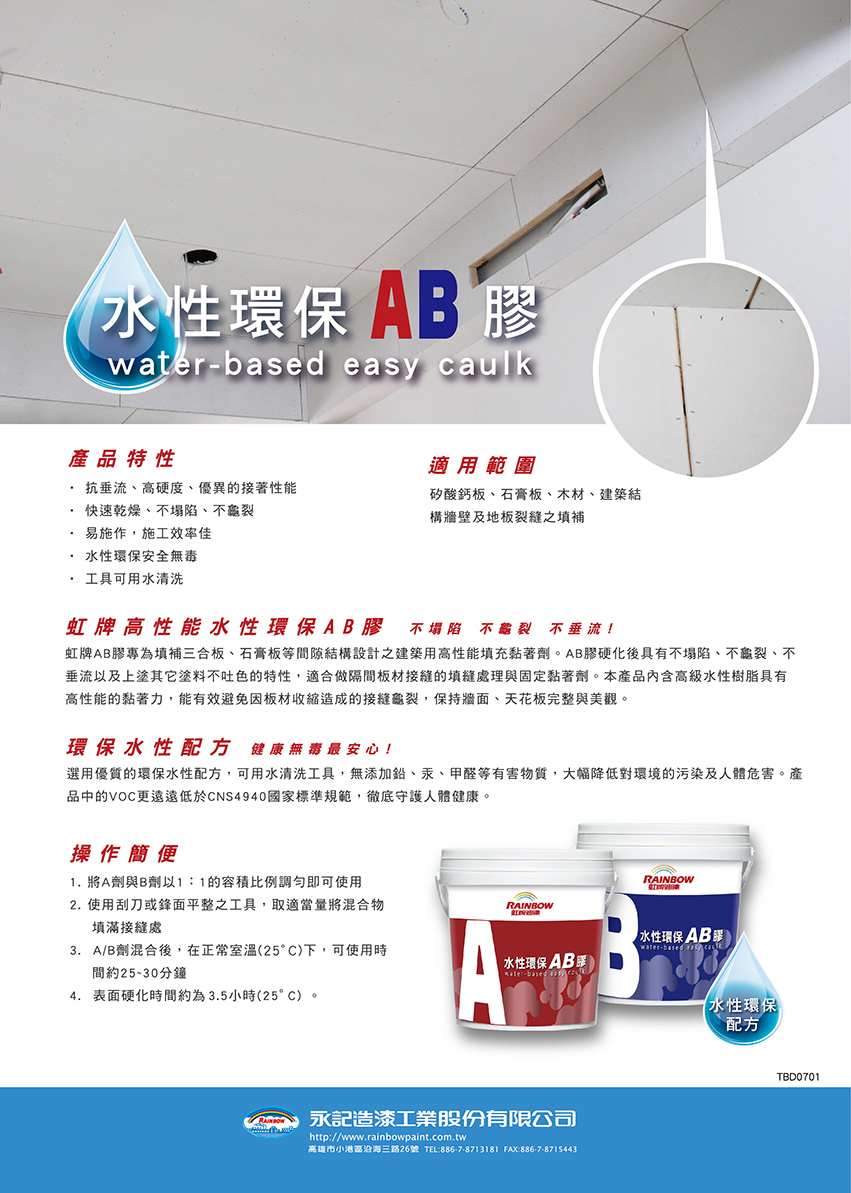 虹牌AB膠專為填補三合板、石膏板等間隙結構設計之建築用高性能填充黏著劑。AB膠硬化後具有不塌陷、不龜裂、不垂流,以及上塗其他塗料不吐色的特性,適合做隔間板材接縫的填縫處理與固定黏著劑。本產品內含高級水性樹脂具有高性能的黏著力,能有效避免因板材收縮造成的接縫龜裂,保持牆面、天花板完整與美觀。