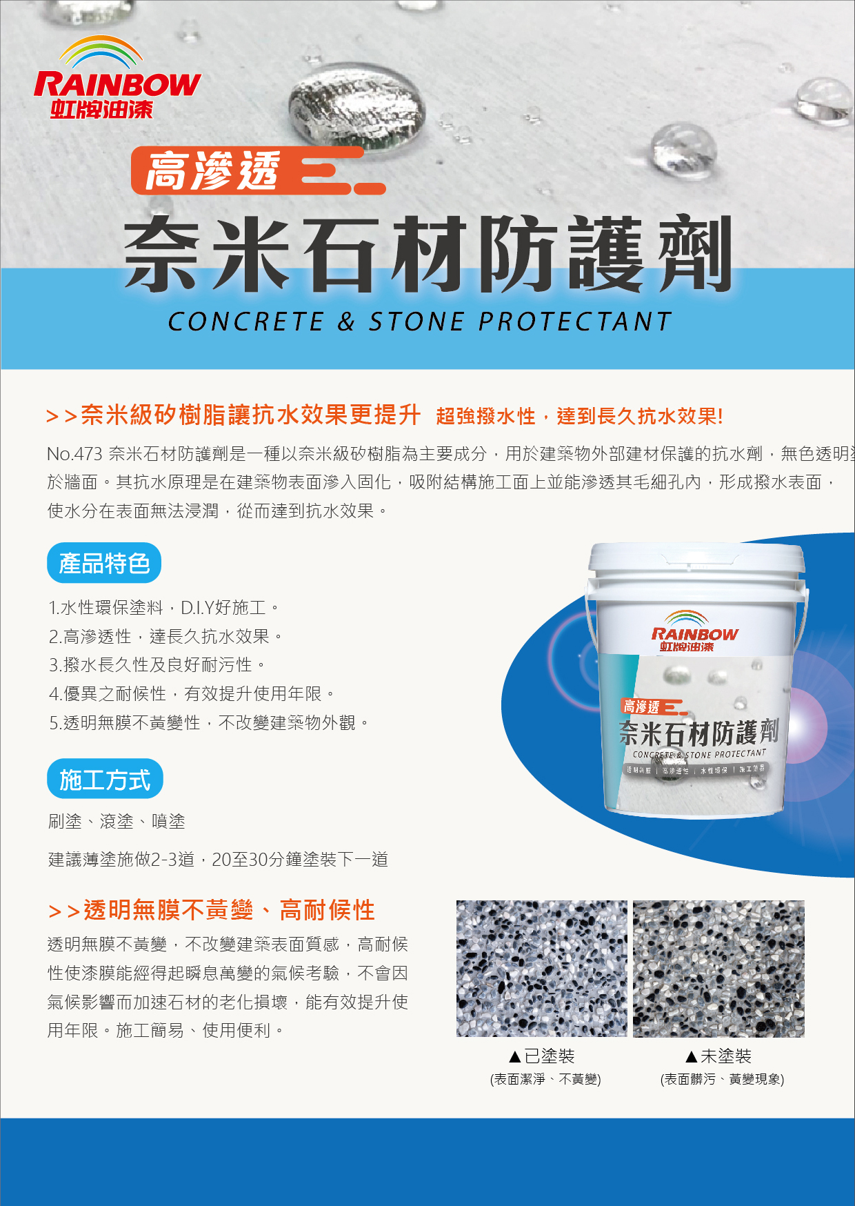 No.473 奈米石材防護劑是一種以奈米級矽樹脂為主要成分,用於建築物外部建材保護的抗水劑,無色透明刷於牆面。其抗水原理是在建築物表面滲入固化,吸附結構施工面上並能滲透其毛細孔內,形成撥水表面,使水分在表面無法浸潤,從而達到抗水效果。