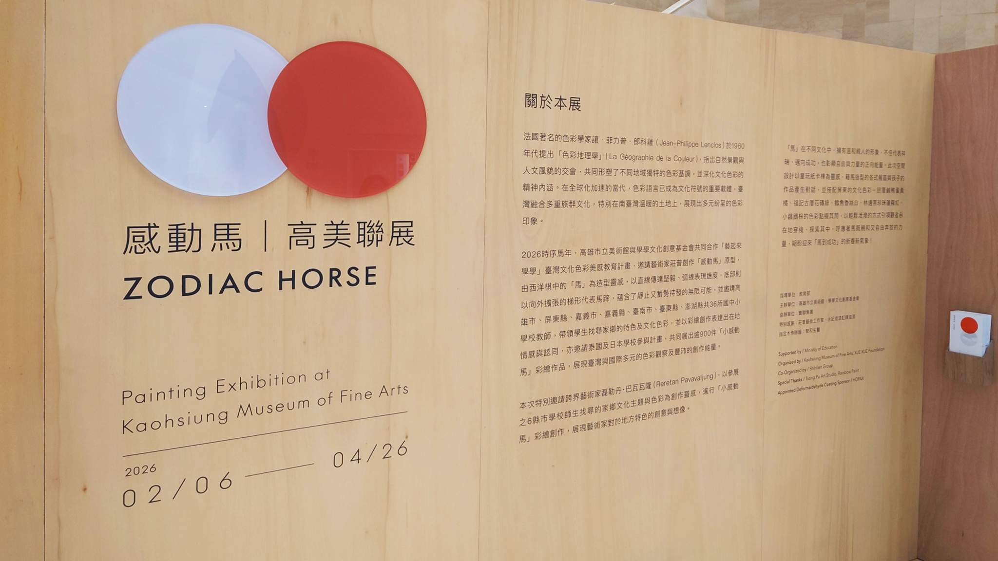 適逢2026馬年,展覽邀請藝術家莊普創作《感動馬》原型作品,以西洋棋中的「馬」為造型靈感,透過直線與弧線的組合,象徵堅毅、速度與蓄勢待發的能量,寓意迎向嶄新未來的正向力量。展覽計畫同時串聯高雄市、屏東縣、嘉義市、嘉義縣、臺南市、臺東縣與澎湖縣共36所國中小學,由教師們帶領學生找尋家鄉文化特色與色彩意象,並透過彩繪創作表達在地情感與文化認同。
