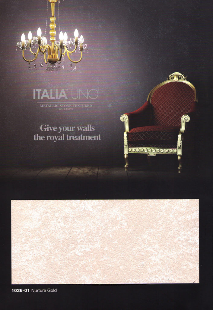 使用ITALIA專用壁紙漆,當然要挑選你喜歡的顏色!需施作兩層壁紙漆,第一層刷塗後至少經二小時完全乾燥,再塗上第二層;第二層經過三小時完全乾燥後,便可施作ITALIA UNO+ 或 ITALIA DUE之面漆。使用交叉手勢刷塗,一面牆由同一人施作,以保持風格一致!越不規則的的刷塗方式,效果越美麗!在半乾的時候使用漆刷刷塗,將珍珠粉的色粒翻出,效果更鮮明!